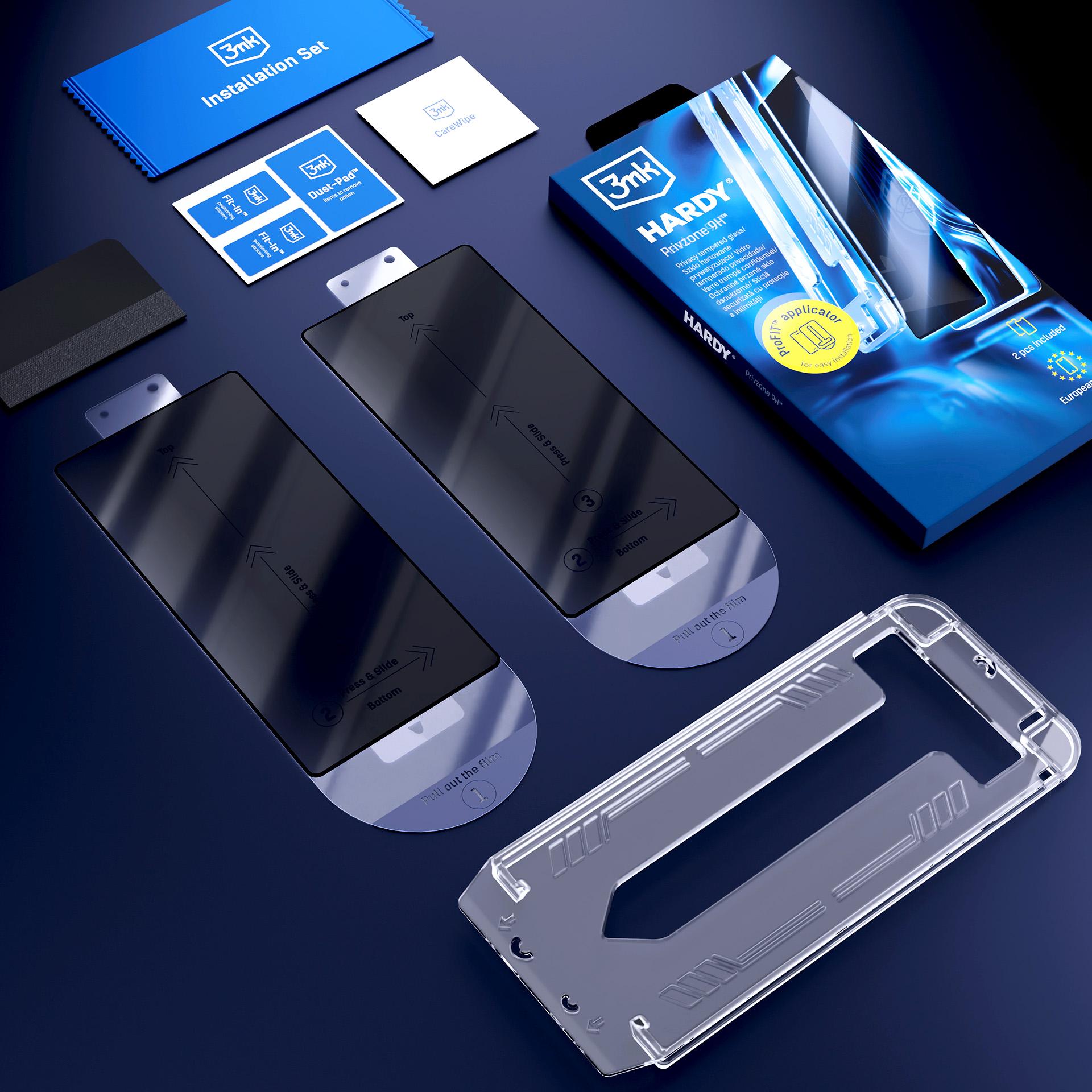 O vidro temperado com função de privacidade protege o ecrã contra olhares laterais a partir de um ângulo de 28°. Inclui o aplicador ProFIT™, que permite uma instalação rápida e precisa, sem bolhas nem pó. O conjunto inclui 2 unidades – uma para usar de imediato, a outra de reserva.