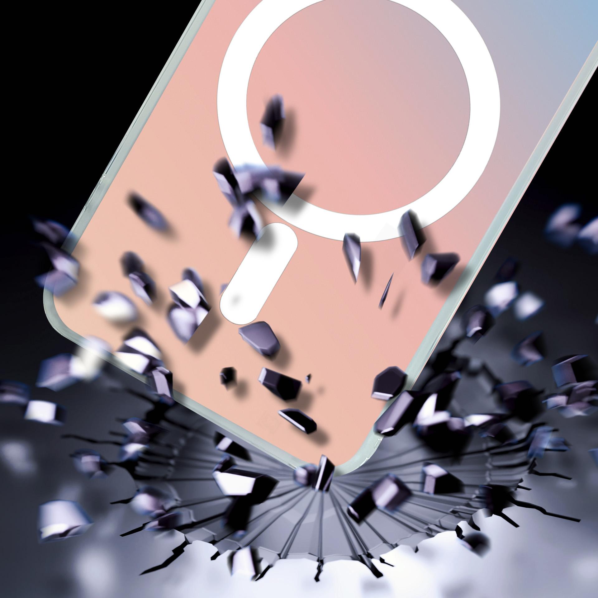 Capa holográfica com MagSafe que muda de cor em cada ângulo. Os cantos reforçados absorvem os choques, as bordas elevadas protegem o ecrã e a câmara, e a certificação Military Grade confirma 26 quedas sem danos. Estilo e proteção sem compromissos.