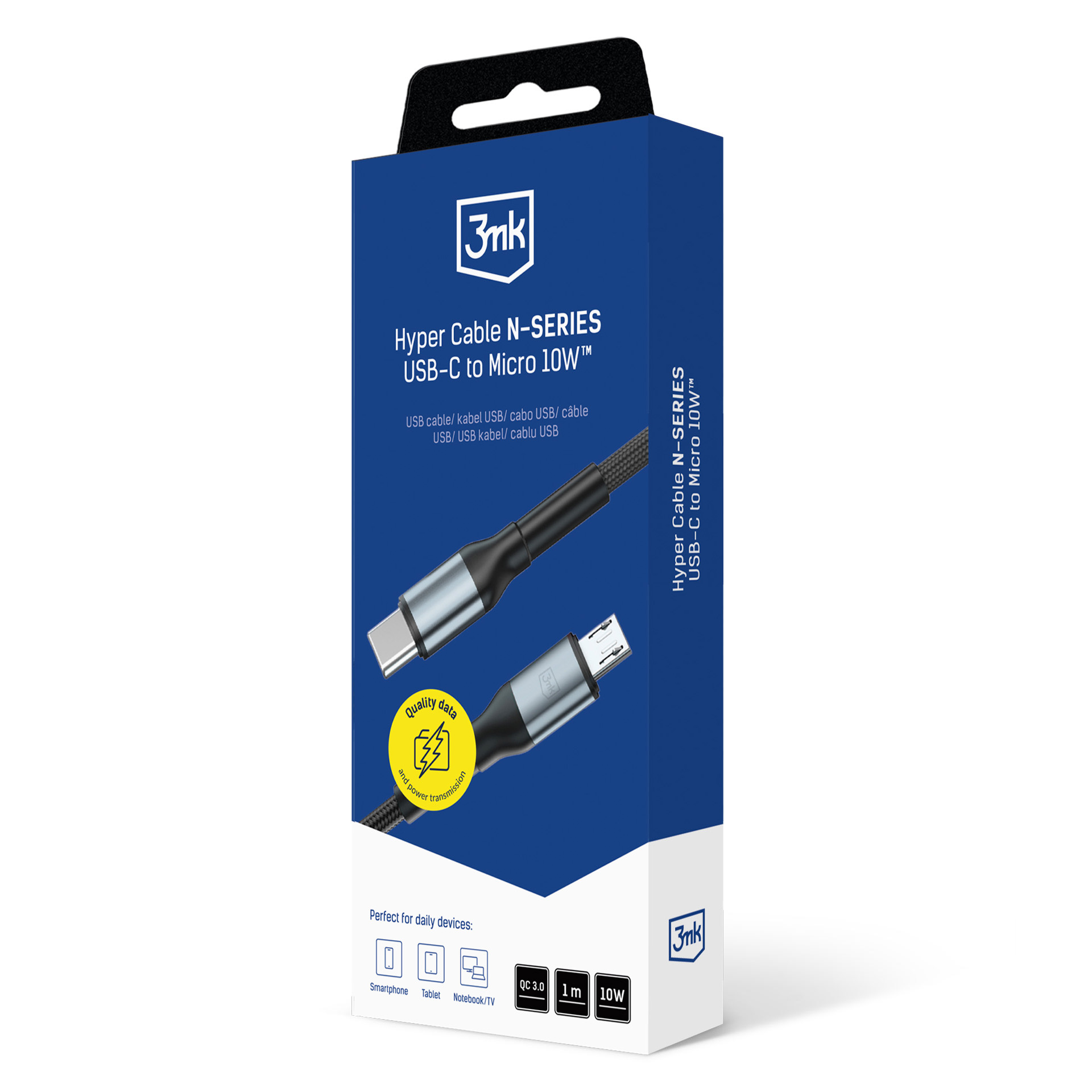 O cabo de 1 metro em preto clássico foi projetado para uso diário intensivo. Reforços sólidos nos pontos críticos, especialmente junto às extremidades, protegem o cabo contra danos e tensões causadas por dobras ou ligações frequentes. Assim, o cabo mantém-se durável e fiável ao longo do tempo, независимо de ser usado em casa, no escritório ou em viagem.