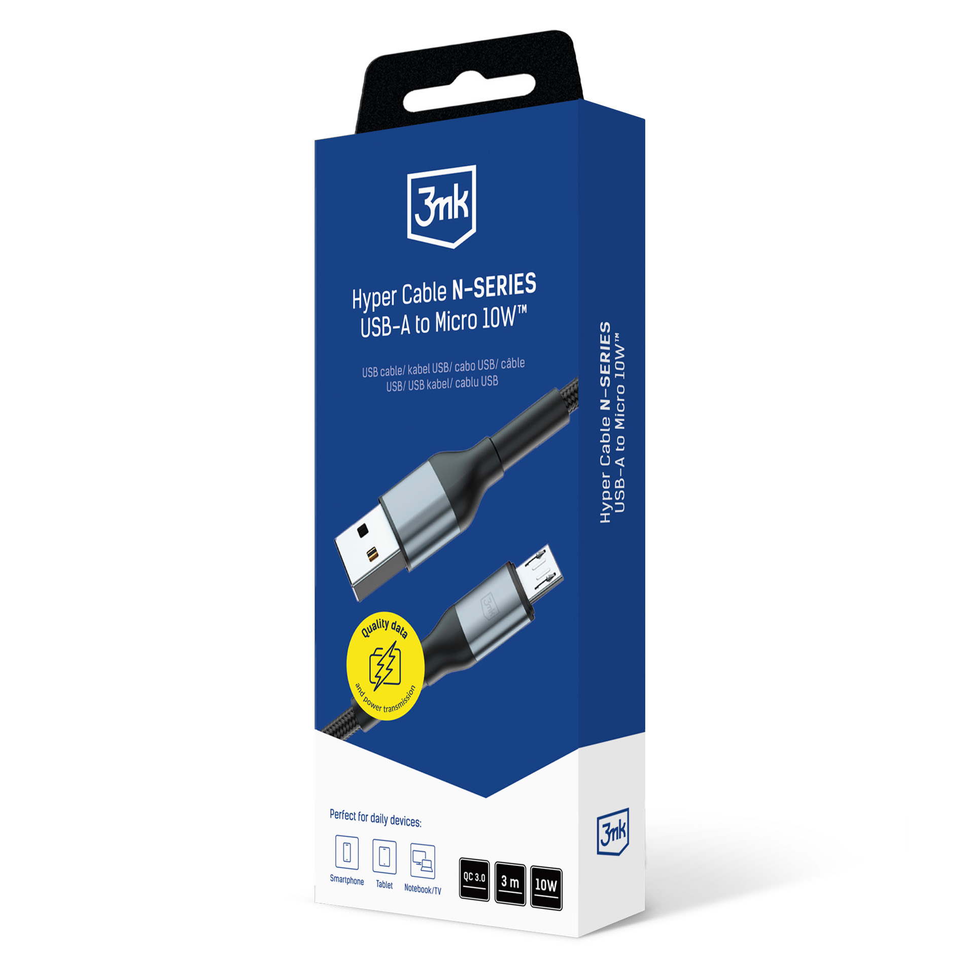 Cabo resistente Hyper Cable N-SERIES com 3 m de comprimento, ligando USB-C a Micro USB. A trança de nylon e os conectores de alumínio garantem durabilidade, enquanto o alcance extremo proporciona total liberdade ao carregar colunas, câmaras ou acessórios smart home. Transferência fiável e carregamento de 10W.