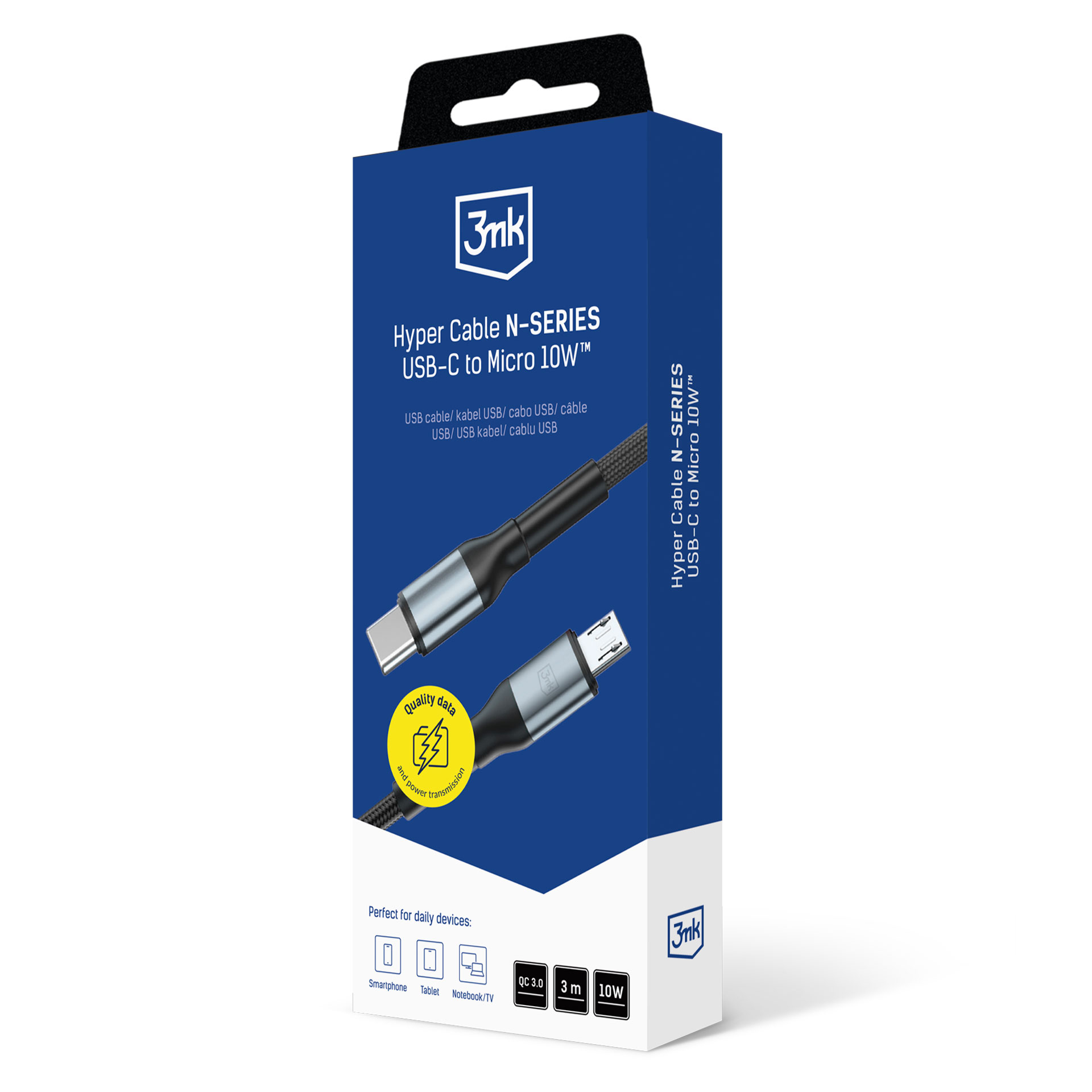 Cabo resistente Hyper Cable N-SERIES USB-A para Micro USB com 3 m de comprimento. A trança de nylon e os conectores de alumínio garantem fiabilidade, enquanto o alcance extremo proporciona total liberdade ao carregar colunas, câmaras ou acessórios longe da tomada. Carregamento estável de 10W e transferência de dados.